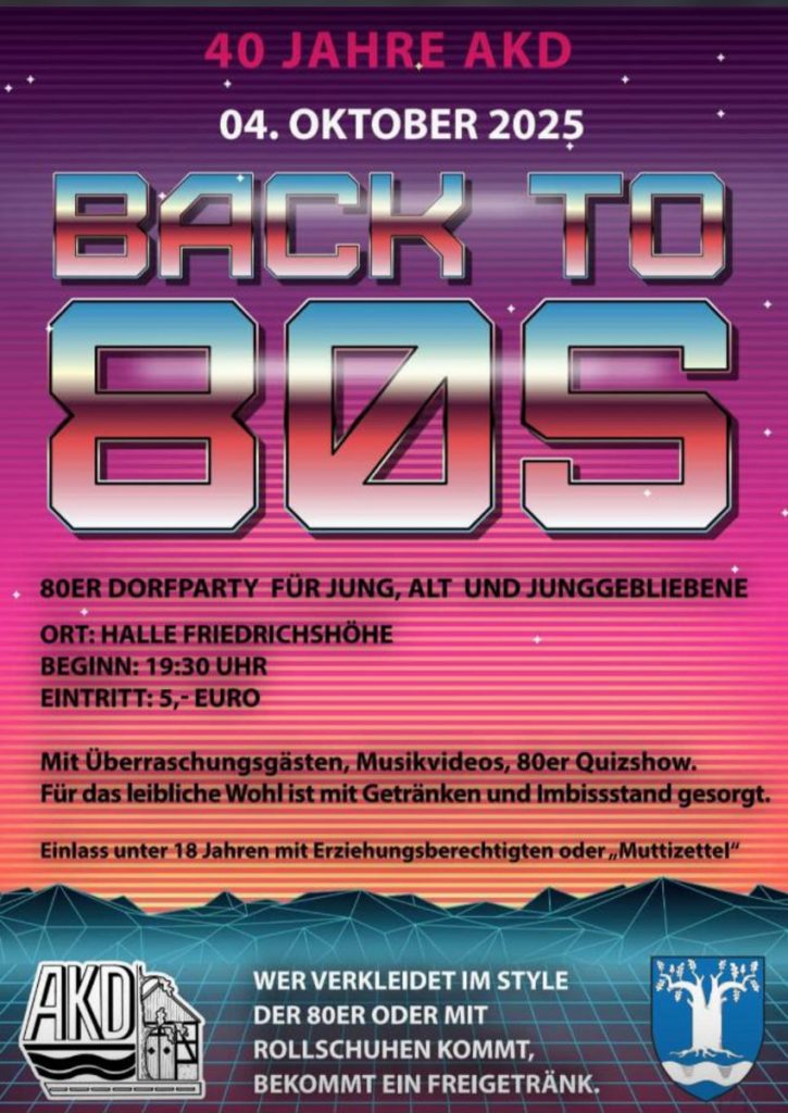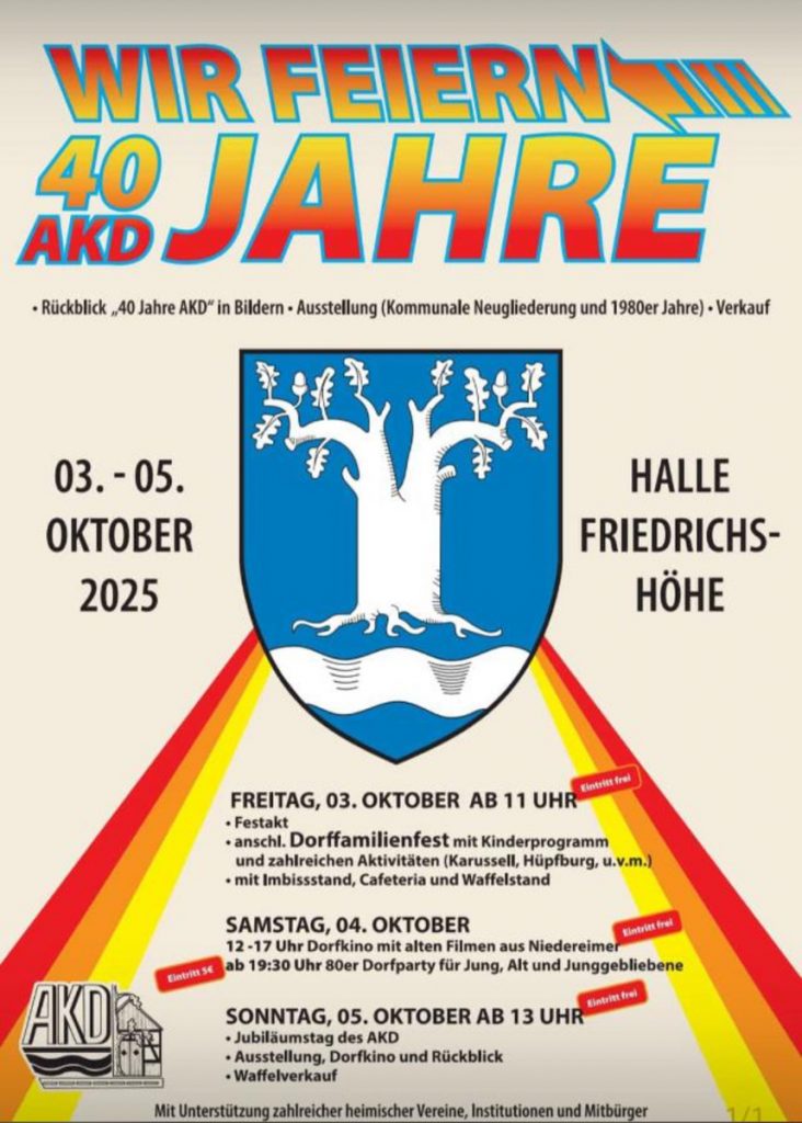 Vom 3. bis 5. Oktober lädt der AKD Niedereimer zum großen Jubiläumswochenende: mit einer 80-er-Dorfparty voller Glitzer, Beats und Schulterpolstern, einem fröhlichen Familienfest für Groß und Klein sowie einer facettenreichen Ausstellung. Von alten Fotos bis zu kuriosen Fundstücken: Hier trifft Nostalgie auf Neugier, Vergangenheit auf Gegenwart. Kommt vorbei und feiert mit!