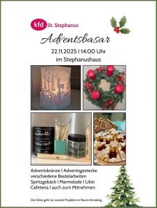 Adventsbasar KFD St. Stephanus Wann 22. November 2025 0:00 Zum Kalender hinzufügen ICS herunterladen Google Kalender iCalendar Office 365 Outlook Live