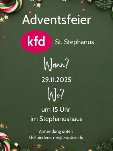 Adventsfeier KFD St. Stephanus Wann 29. November 2025 0:00 Zum Kalender hinzufügen ICS herunterladen Google Kalender iCalendar Office 365 Outlook Live
